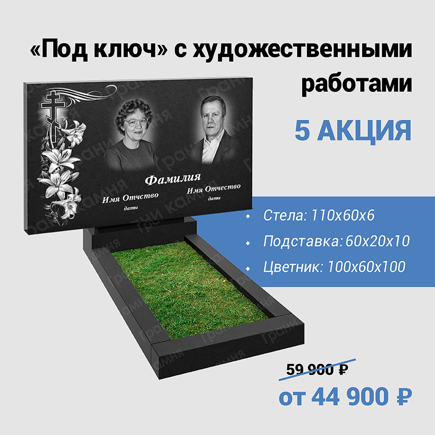 Горизонтальный прямоугольный памятник из гранита "под ключ" на двоих с гравировкой портретов и прочих художественных элементов. В комплекте стела 110х60х6, подставка 60х20х10 и цветник из гранита 100х60х100.