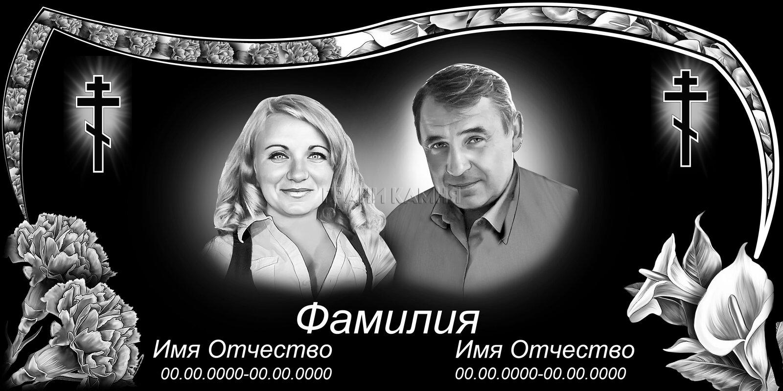 Горизонтальный гранитный памятник семейный с крестом и цветами №4